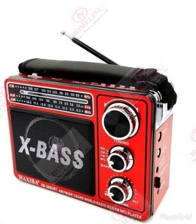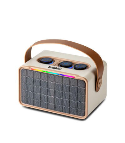 - Design: It features a retro or classic aesthetic with control knobs on top and a textured speaker grille.