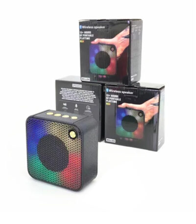 - Design: The speaker has a compact, square design with a colorful, dotted RGB light-style grille on the front.