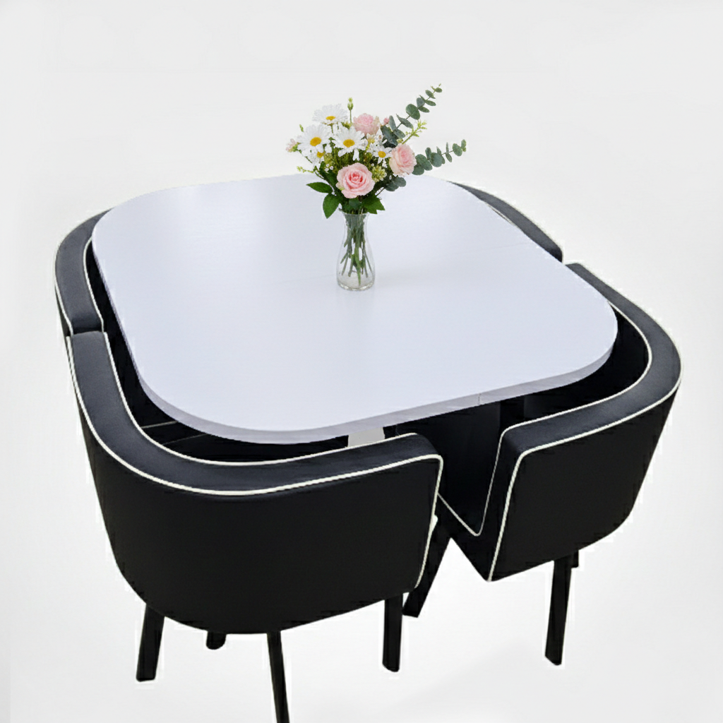 This product is a modern, space-saving dining table and chair set. It features a square white table with rounded corners and four black, curved chairs with white piping designed to fit neatly underneath. The tabletop is often made of thick wood, while the table and chair legs are typically constructed from steel. The chair seats may be upholstered in high-quality, wear-resistant leather. This design is intended to be both stylish and functional for home dining or business use, offering a high safety factor and stable structure.
