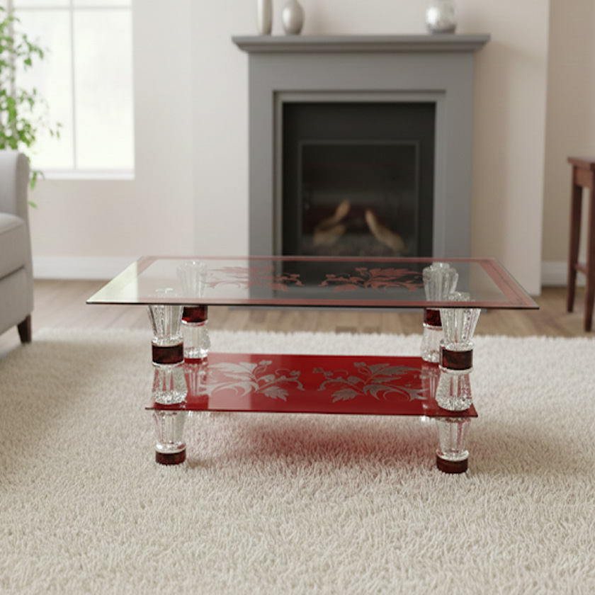 - Design: The table has a modern aesthetic with a two-tiered structure. Both the top glass surface and the lower shelf feature an elegant red and white/cream floral pattern.