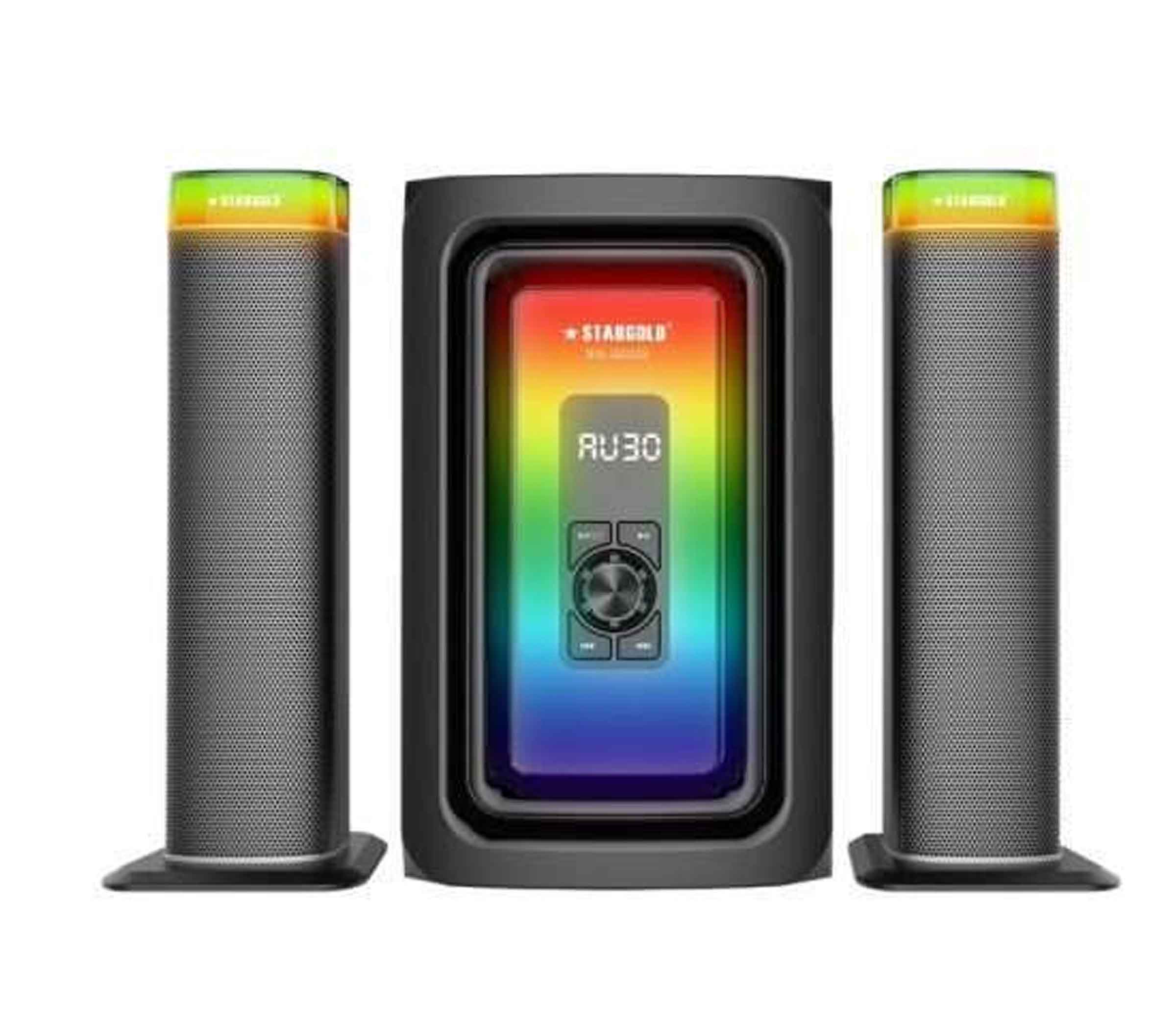- Design: The system consists of a main unit and two satellite speakers, all featuring LED lighting.