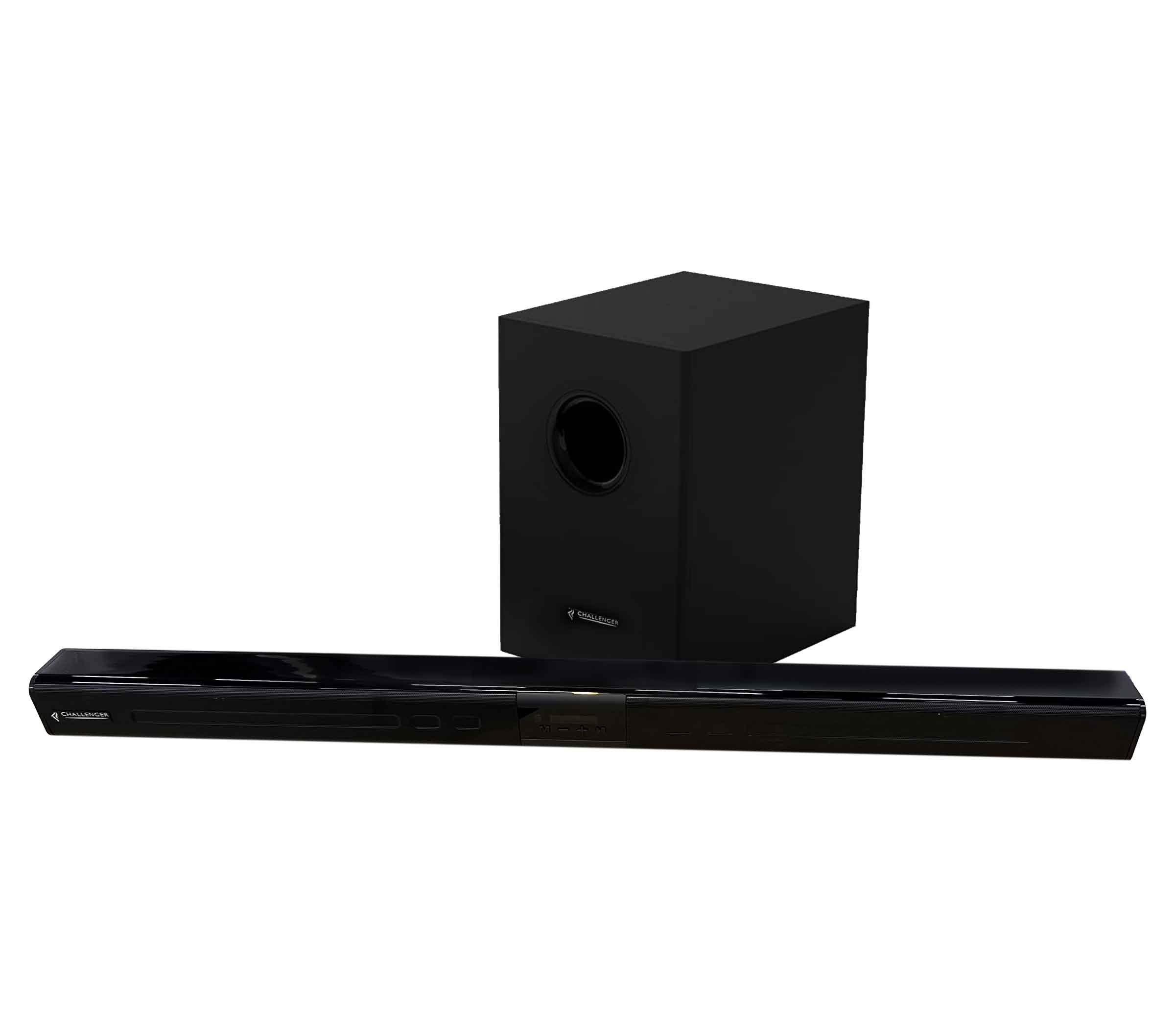 - Components: The system includes a soundbar and a separate subwoofer.