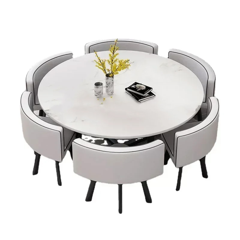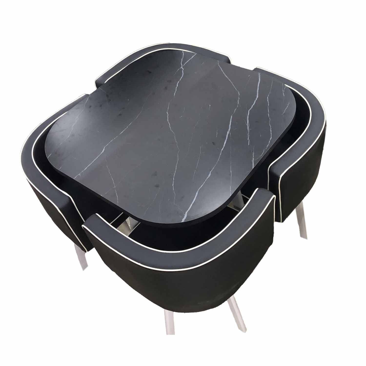 This elegant dining set features a sleek, square marble-top table with a distinctive grey veining pattern, offering a sophisticated centerpiece for any dining space. The table is complemented by four chairs designed to neatly tuck underneath, maximizing space and maintaining a clean, uncluttered aesthetic. The chairs are upholstered in a dark fabric, possibly faux leather, with a contrasting light trim, providing both comfort and a touch of modern style.
