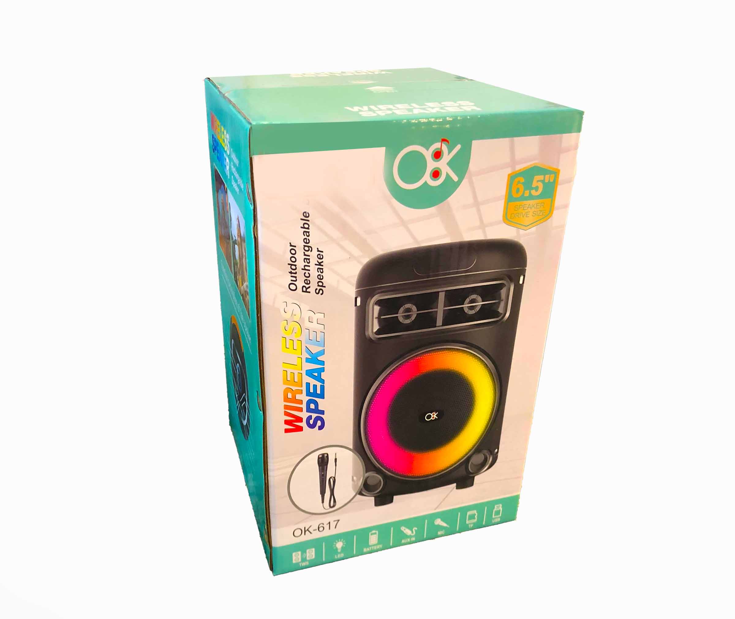 Take your music anywhere with the OK-617 Wireless Outdoor Rechargeable Speaker. Featuring a 6.5″ speaker driver, dynamic LED lights, and clear, powerful sound, it’s perfect for parties, gatherings, and outdoor fun. With wireless connectivity, built-in rechargeable battery, and included microphone, it’s ideal for both music and karaoke.