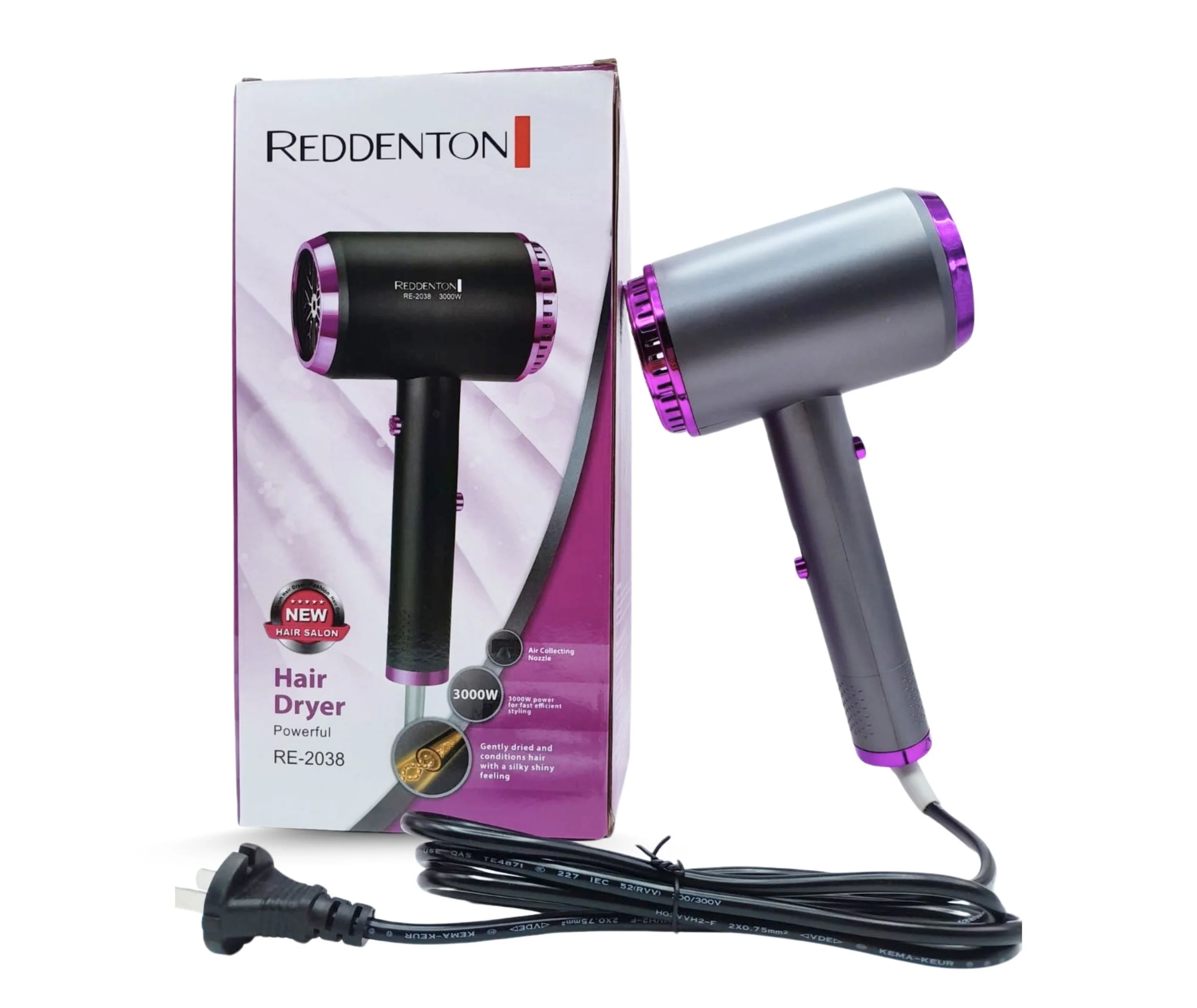 Introducing the powerful REDDENTON Hair Dryer, model RE-2038, designed to deliver salon-quality results at home. This new hair dryer boasts a robust 3000W motor for fast and efficient drying, ensuring your hair is gently dried and left with a silky, shiny finish. Its sleek design and vibrant purple accents make it a stylish addition to your hair care routine. Perfect for achieving professional blowouts or simply drying your hair quickly, the REDDENTON RE-2038 combines power and performance for exceptional results.
