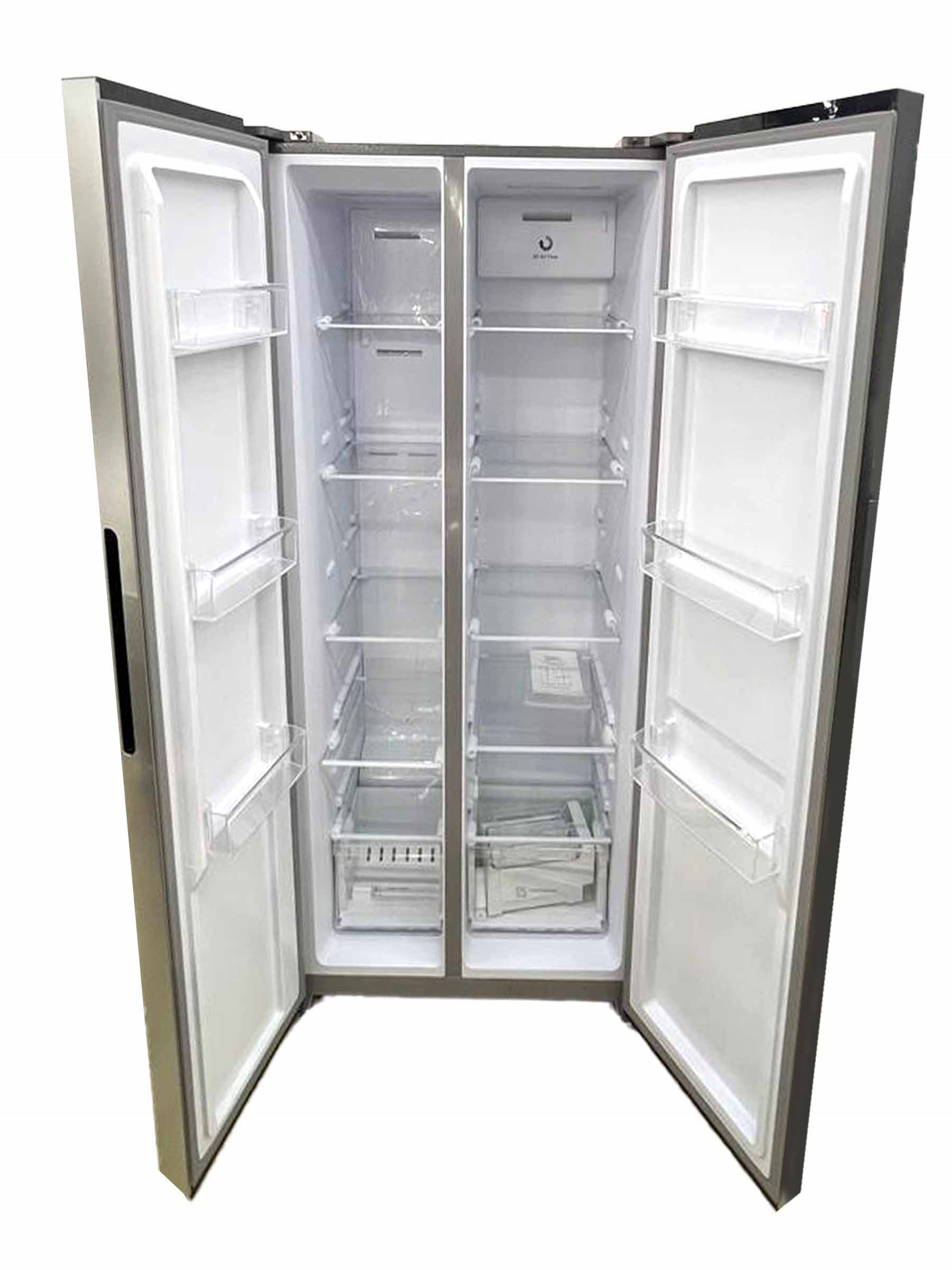 Design: The refrigerator has a stainless steel-like finish and a double-door, side-by-side configuration.